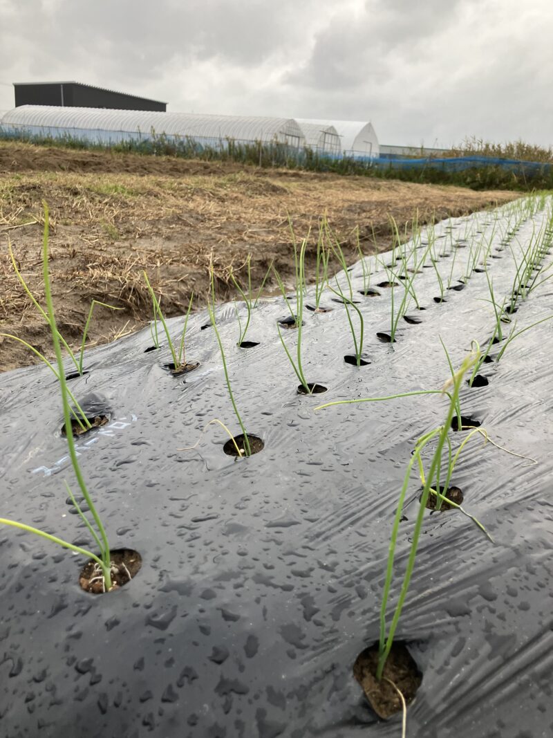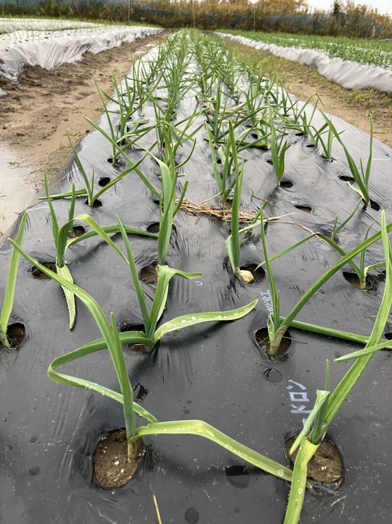 露地では育苗していた玉ねぎの苗を植えました。9月に植えたニンニクも大きくなっています。どちらも越冬させるので、今のうちに栄養を蓄えてもらいます。これからの作業は、植穴の除草と積雪に備えるためのトンネルの設置です。